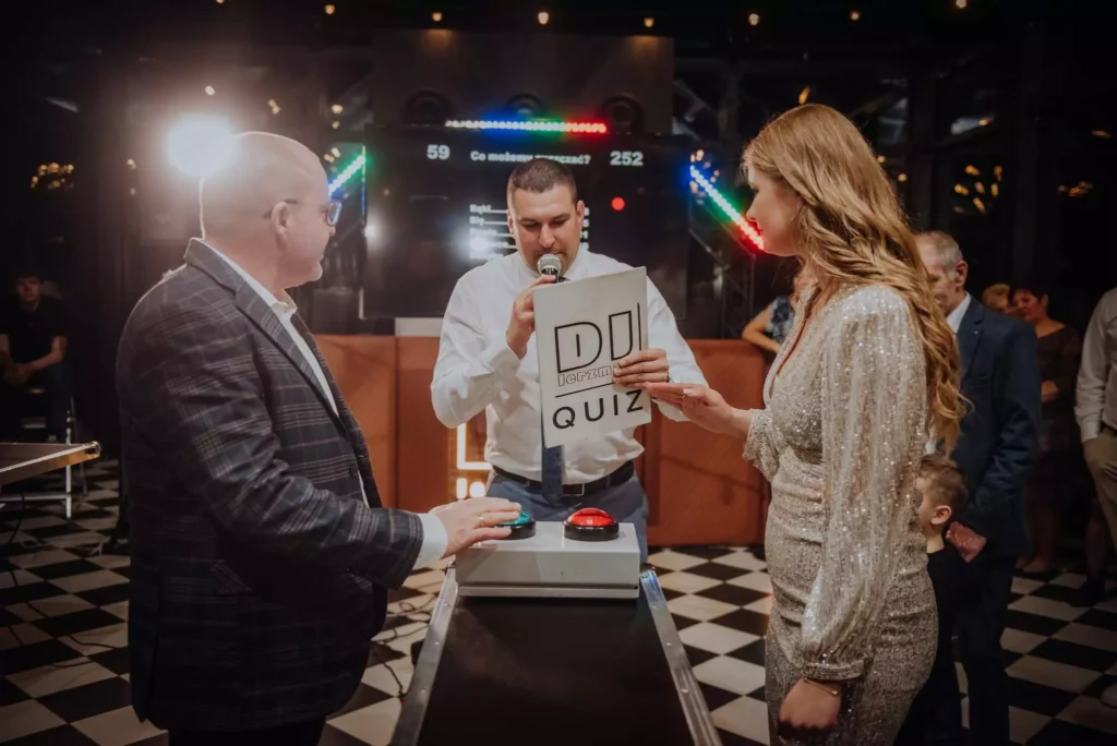 W moim repertuarze znajdziesz wiele przetestowanych konkursów, które angażują gości. Od 2017 roku prowadzę autorską wersję zabawy inspirowanej popularną Familiadą. To quiz na imprezę, w którym pytania dopasowuję do charakteru wydarzenia. Przykładowo mogą dotyczyć pary młodej, firmy lub solenizanta. Na dużym ekranie wyświetlam wyniki rozgrywek, a drużyny rywalizują ze sobą, naciskając przyciski. Quiz na wzór znanej Familiady na imprezę gwarantuje zabawne efekty dźwiękowe, punktację na żywo oraz salwy śmiechu!