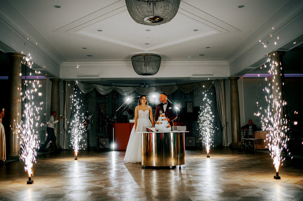 Dwie z proponowanych przeze mnie usług dodatkowych polecam szczególnie parom młodym. Umożliwiają bowiem podkreślenie kluczowych momentów podczas wesela. Jedną z nich jest ciężki dym na pierwszy taniec, który sprawia, że para młoda wygląda, jakby poruszała się w chmurach. Goście, oglądając ten wzruszający spektakl, otwierają usta z zachwytu. Drugą tego typu atrakcją są fontanny iskier na wesele. Można wykorzystać je również podczas pierwszego tańca lub na przykład w momencie wspólnego krojenia tortu przez nowożeńców. Efekt unoszących się w powietrzu, świecących drobinek robi ogromne wrażenie na żywo i wygląda obłędnie na filmach.
