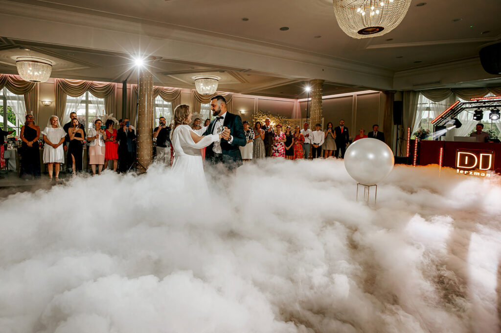 Ciężki dym i fontanny iskier na wesele – taniec w chmurach